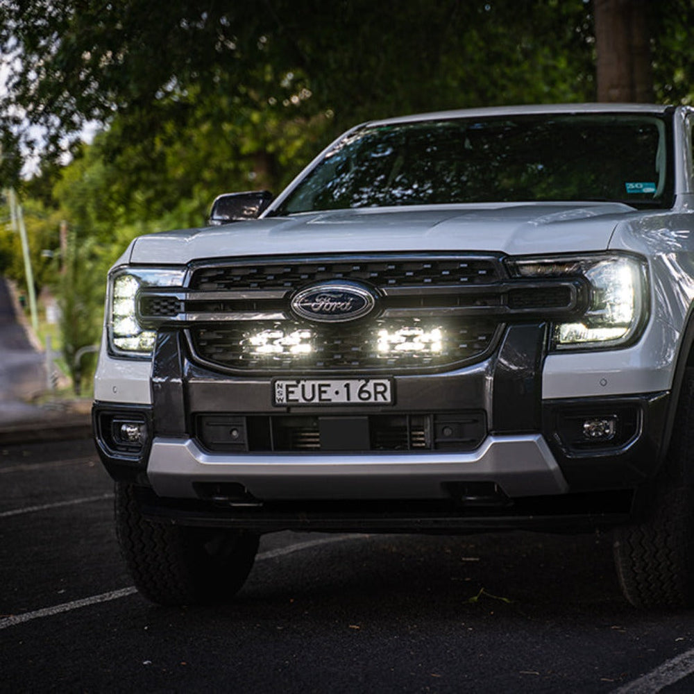 TrailBait Next-Gen Ranger Behind-Grille Light Bar — the smartest way to add serious lighting power without fitting a bull bar. This hidden twin-light setup mounts securely to the vehicle framework (not the grille or bumper), giving you rock-solid performance with zero shake on rough terrain.