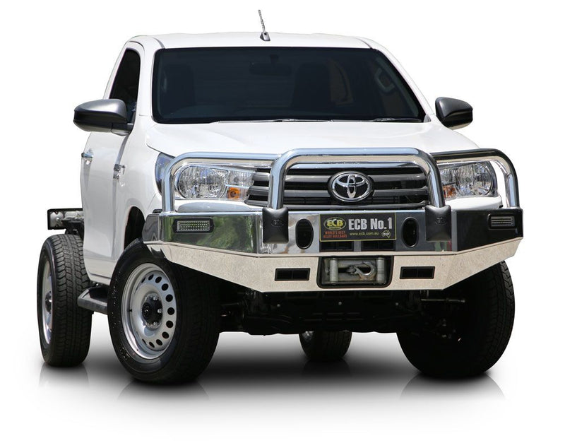 For the ultimate in frontal protection you will find it hard to go past the strength. quality and style of the ECB Winch Compatible Big Tube Bullbar Suitable for Toyota Hilux. The single piece channel is fully welded and manufactured from high tensile. structural grade alloys to provide maximum strength. This no compromise design is engineered to accommodate up to a 10.500lb low mount winch that is attached to the chassis as part of the specifically designed steel mounting system ensuring a neat and sturdy fit. Our Winch Compatible Big Tube Bar® incorporates a full width. braced lower protection skirt. ECB LED light combinations. air directional cooling vents and an aerial bracket are all standard features. Your ECB Winch Compatible Big Tube Bar® is available in a mirror polished finish or choose from one of our low maintenance powder coat finishes. Our ECB Winch Compatible Big Tube Bar® is proudly manufactured in Australia and we offer a lifetime warranty.