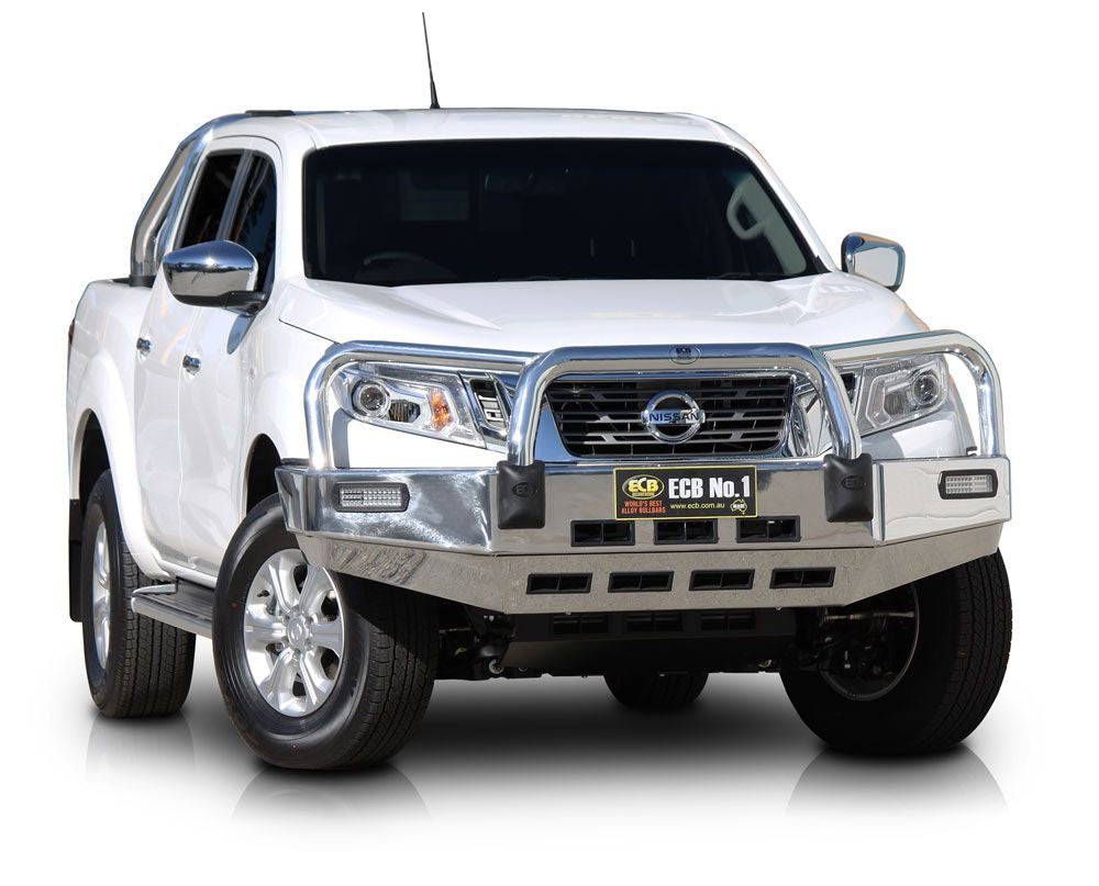 For the ultimate in frontal protection you will find it hard to go past the strength. quality and style of the ECB Winch Compatible Big Tube Bullbar for your Nissan Navara NP300. The single piece channel is fully welded and manufactured from high tensile. structural grade alloys to provide maximum strength. This no compromise design is engineered to accommodate up to a 10.500lb low mount winch that is attached to the chassis as part of the specifically designed steel mounting system ensuring a neat and sturdy fit. Our Winch Compatible Big Tube Bar® incorporates a full width. braced lower protection skirt. ECB LED light combinations. bumper lights. air directional cooling vents and an aerial bracket are all standard features. Your ECB Winch Compatible Big Tube Bar® is available in a mirror finished polished alloy or choose from one of our low maintenance powder coat finishes. Our ECB Winch Compatible Big Tube Bar® is proudly manufactured in Australia and we offer a lifetime warranty.