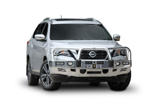 For the ultimate in frontal protection you will find it hard to go past the strength. quality and style of the ECB Big Tube Bullbar for your Nissan Pathfinder R52. The single piece channel is fully welded and manufactured from high tensile. structural grade alloys to provide maximum strength. Our Big Tube Bar® incorporates a full width. braced lower protection skirt and the specifically designed steel mounting system ensures a neat and sturdy fit. ECB LED light combinations. bumper lights. air directional cooling vents and an aerial bracket are all standard features. Your ECB Big Tube Bar® is available in a mirror finished polished alloy or choose from one of our low maintenance powder coat finishes. Our ECB Big Tube Bar® is proudly manufactured in Australia and we offer a lifetime warranty.