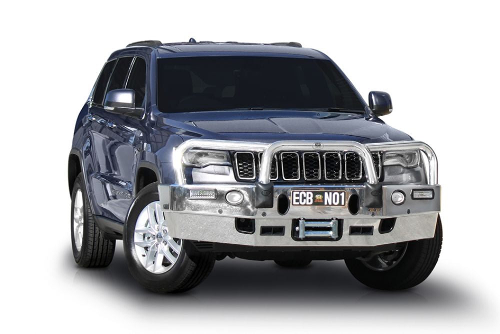 For the ultimate in frontal protection you will find it hard to go past the strength. quality and style of the ECB Winch Compatible Big Tube Bullbar for your Jeep Grand Cherokee Laredo. The single piece channel is fully welded and manufactured from high tensile. structural grade alloys to provide maximum strength. This no compromise design is engineered to accommodate up to a 10.500lb low mount winch that is attached to the chassis as part of the specifically designed steel mounting system ensuring a neat and sturdy fit. Our Winch Compatible Big Tube Bar® incorporates a full width. braced lower protection skirt. ECB LED light combinations. bumper lights. air directional cooling vents and an aerial bracket are all standard features. Your ECB Winch Compatible Big Tube Bar® is available in a mirror finished polished alloy or choose from one of our low maintenance powder coat finishes. Our ECB Winch Compatible Big Tube Bar® is proudly manufactured in Australia and we offer a lifetime warranty.