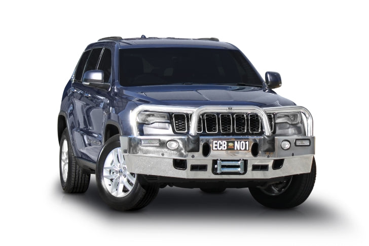 For the ultimate in frontal protection you will find it hard to go past the strength. quality and style of the ECB Winch Compatible Big Tube Bullbar for your Jeep Grand Cherokee Laredo. The single piece channel is fully welded and manufactured from high tensile. structural grade alloys to provide maximum strength. This no compromise design is engineered to accommodate up to a 10.500lb low mount winch that is attached to the chassis as part of the specifically designed steel mounting system ensuring a neat and sturdy fit. Our Winch Compatible Big Tube Bar® incorporates a full width. braced lower protection skirt. ECB LED light combinations. bumper lights. air directional cooling vents and an aerial bracket are all standard features. Your ECB Winch Compatible Big Tube Bar® is available in a mirror finished polished alloy or choose from one of our low maintenance powder coat finishes. Our ECB Winch Compatible Big Tube Bar® is proudly manufactured in Australia and we offer a lifetime warranty.