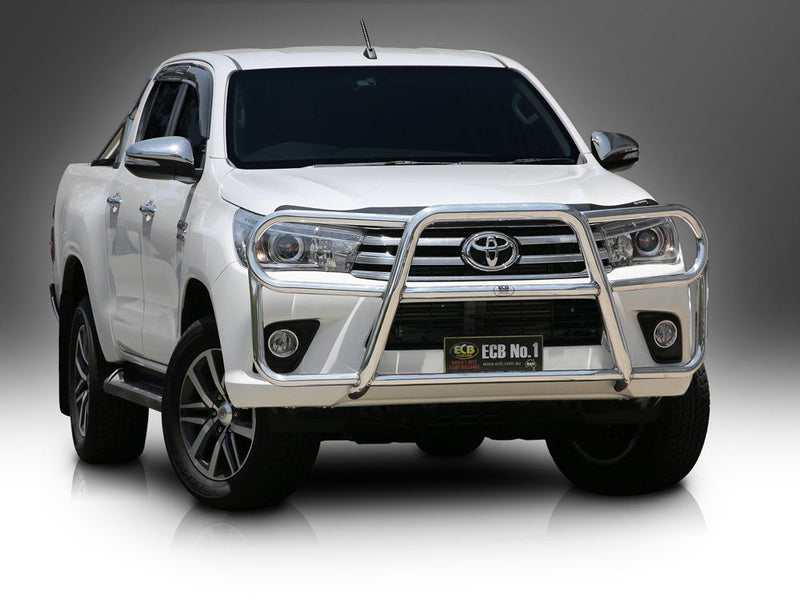 This ECB Type 8 Bar has been Suitable for Toyota  Hilux and will provide frontal protection and enhance the aesthetics of the vehicle. Designed and manufactured in Australia to suit our harsh conditions. this Type 8 Bar is designed to provide optimum protection for the bumper. grille and head lights and is formed from high tensile alloy tubing that will never rust or corrode. Each Type 8 Bar comes standard with spotlight mounting tabs. Our Type 8 Bars come with a lifetime warranty. Your ECB Type 8 Bar is available in a mirror finished polished alloy or choose from one of our low maintenance powder coat finishes.