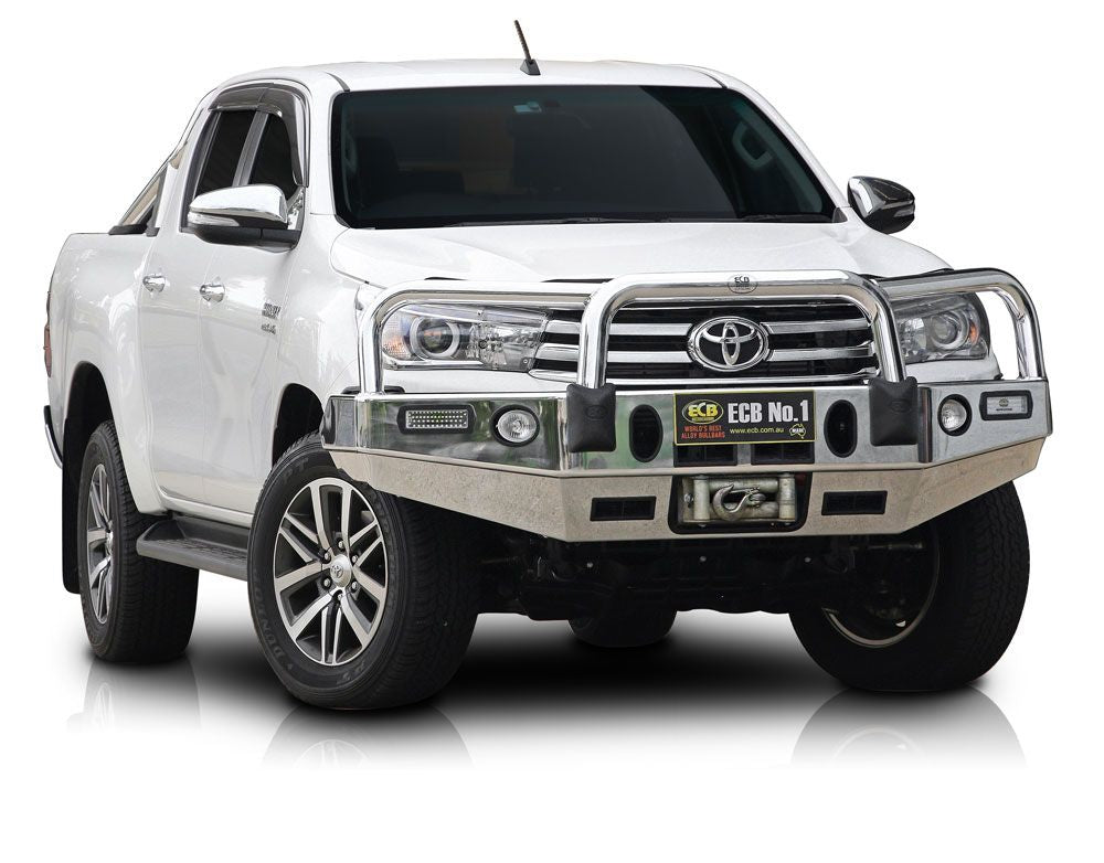 This ECB Type 8 Bar has been designed Suitable for Toyota Hilux and will provide frontal protection and enhance the aesthetics of the vehicle. Designed and manufactured in Australia to suit our harsh conditions. this Type 8 Bar is designed to provide optimum protection for the bumper. grille and head lights and is formed from high tensile alloy tubing that will never rust or corrode. Each Type 8 Bar comes standard with spotlight mounting tabs. Our Type 8 Bars come with a lifetime warranty. Your ECB Type 8 Bar is available in a mirror finished polished alloy or choose from one of our low maintenance powder coat finishes.