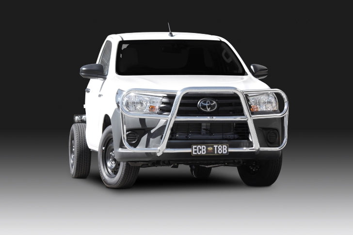 This ECB Type 8 Bar has been designed Suitable for Toyota Hilux WorkMate/Lo-Rider 2wd single cab & dual cab and will provide frontal protection and enhance the aesthetics of the vehicle. Designed and manufactured in Australia to suit our harsh conditions. this Type 8 Bar is designed to provide optimum protection for the bumper. grille and head lights and is formed from high tensile alloy tubing that will never rust or corrode. This Type 8 Bar comes standard with inverted spotlight mounting tabs to mount lights below the lower centre bar and is compatable with front facing camera. Our Type 8 Bars come with a lifetime warranty. Your ECB Type 8 Bar is available in a mirror polished finish or choose from one of our low maintenance powder coat finishes.